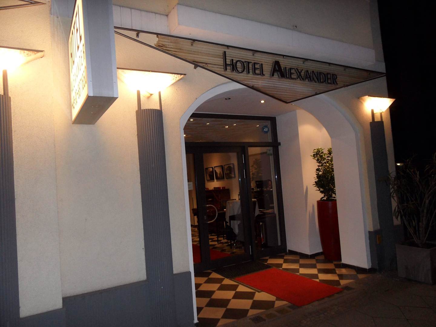Eingang des Hotels in der Nacht
