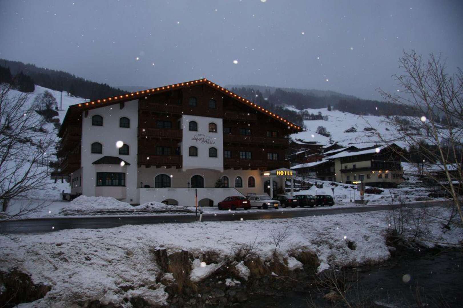 Aussenansicht bei Dämmerung. Das Hotel liegt direkt an der Strasse. Dadurch war für uns aber keine Lärmbelästigung wahrnehmbar. Parallel zur Strasse fliesst ein Bach.