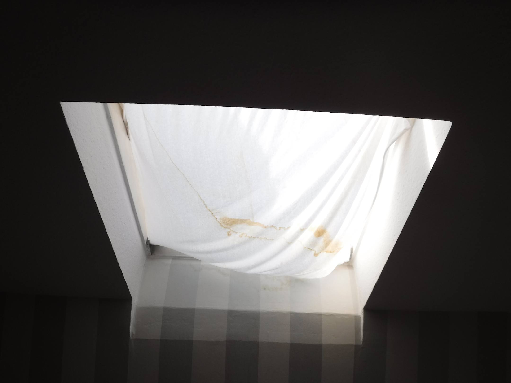 ZimmerSuite Schlafzimmer. Schmutziges Bettlaken vor dem Fenster über dem Bett. Das Fenster lässt sich nicht öffnen, unpraktisch im Sommer.