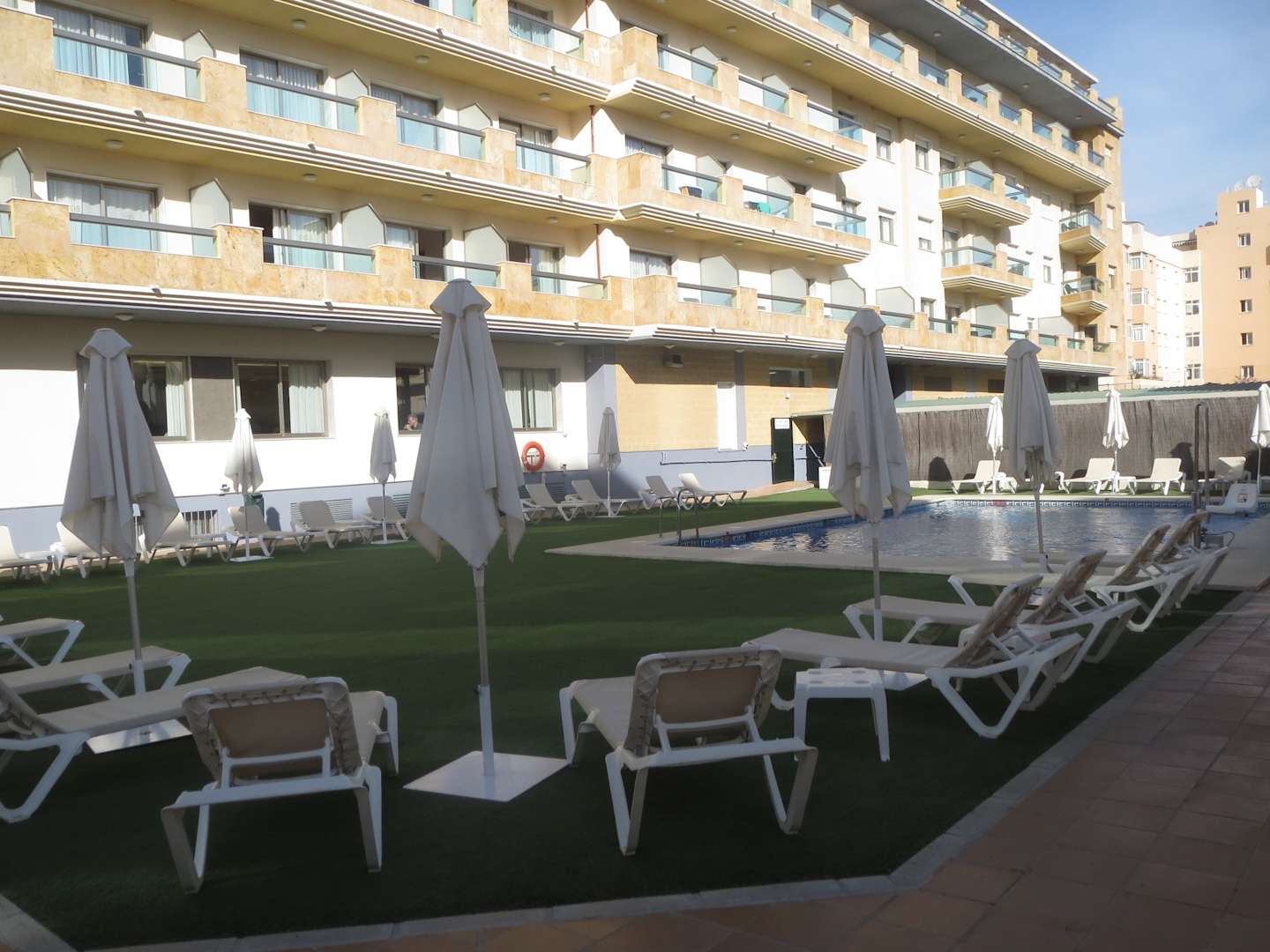 Hotelgebäude mit Poolanlage im Vordergrund