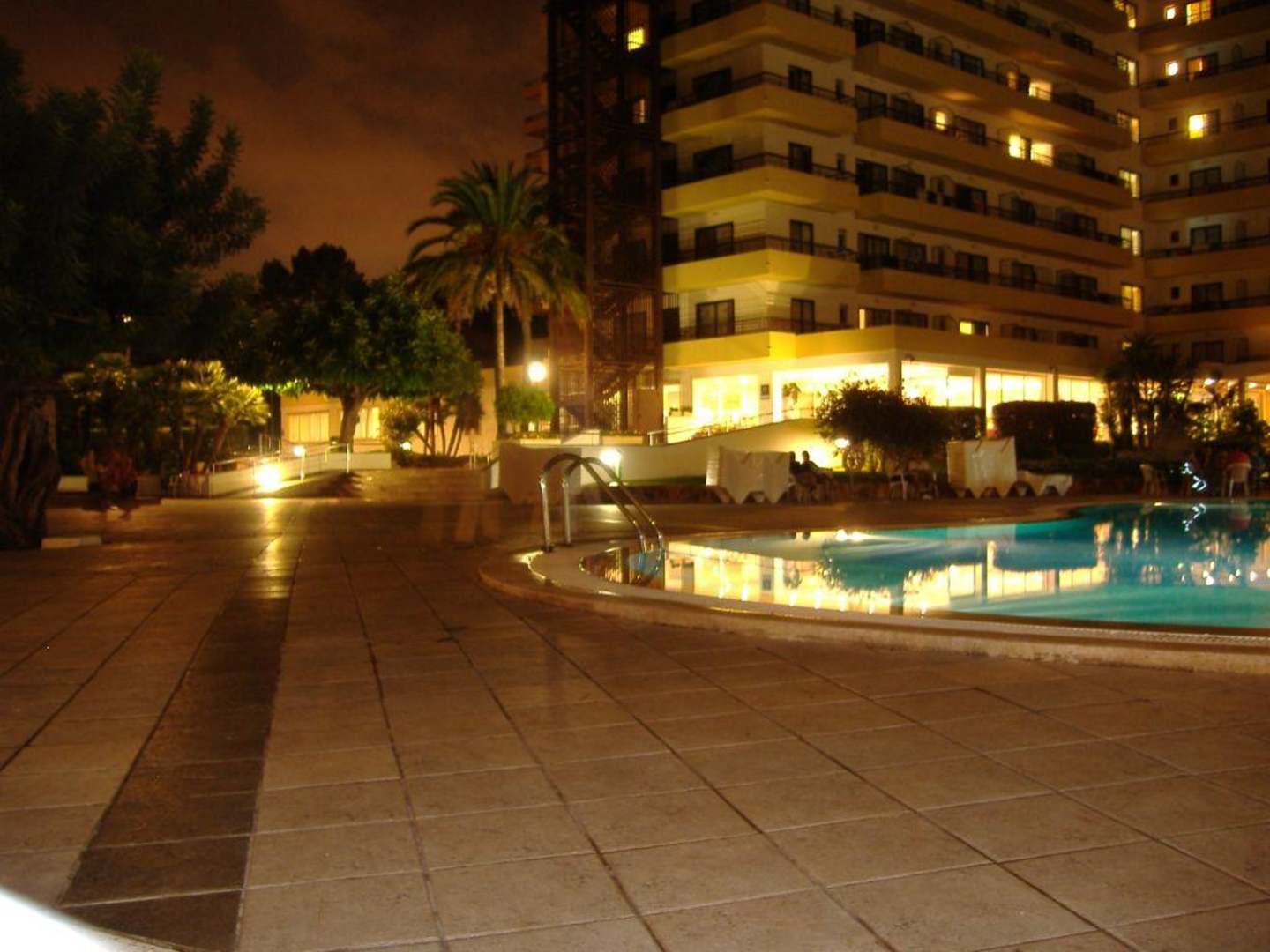 Hotel Eingangsbereich und Teil des Pools abends mit Beleuchtung.