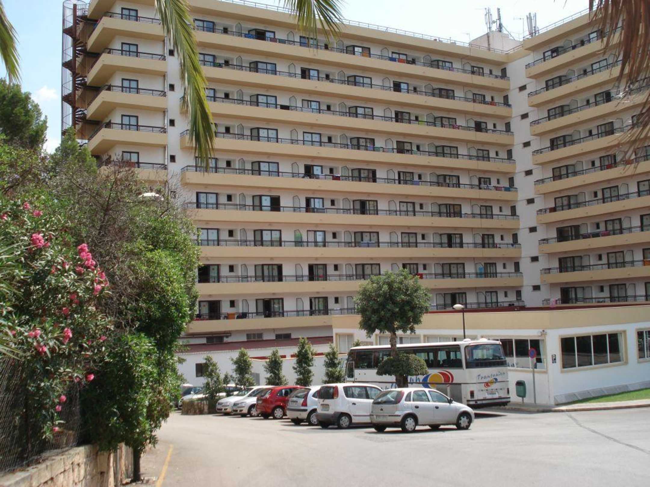 Entree v/h complexvanaf de ingang van het hotel blik is van de achter/zij kant met parkeerplaatsen en de pendelbus voor het strand