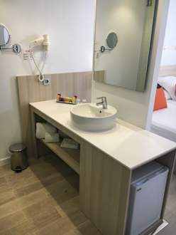Badezimmer mit Waschtisch und viel Ablagefläche.