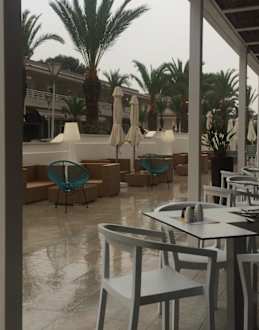 Außenbereich des Restaurants. Viele Tische und gemütliche Sitzgelegenheiten.