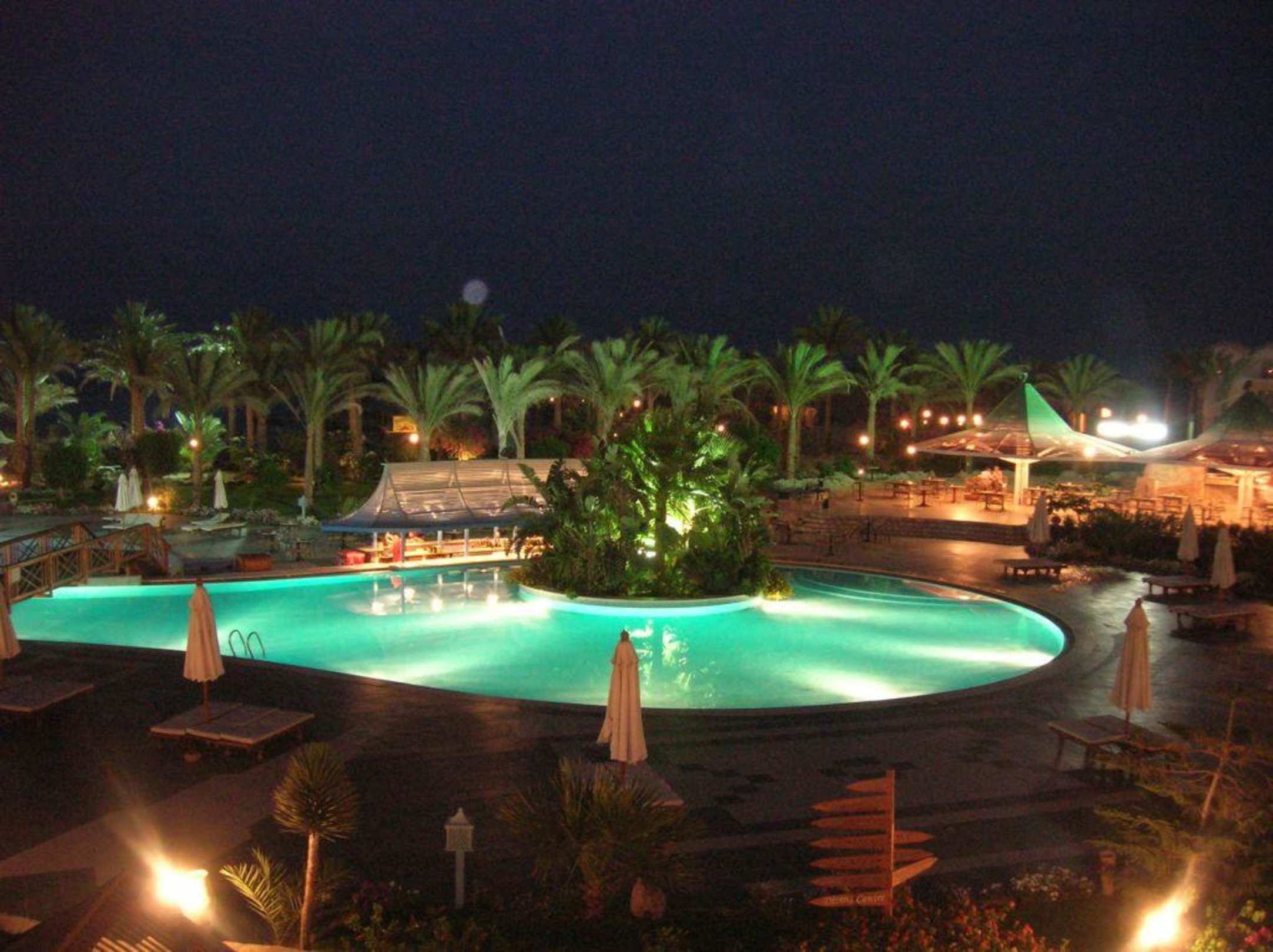 PoolBlick von der Terrasse der Tiffany's Bar auf einen Teil des Pools mit PoolBar sowie rechts die Pizzeria Da Mario