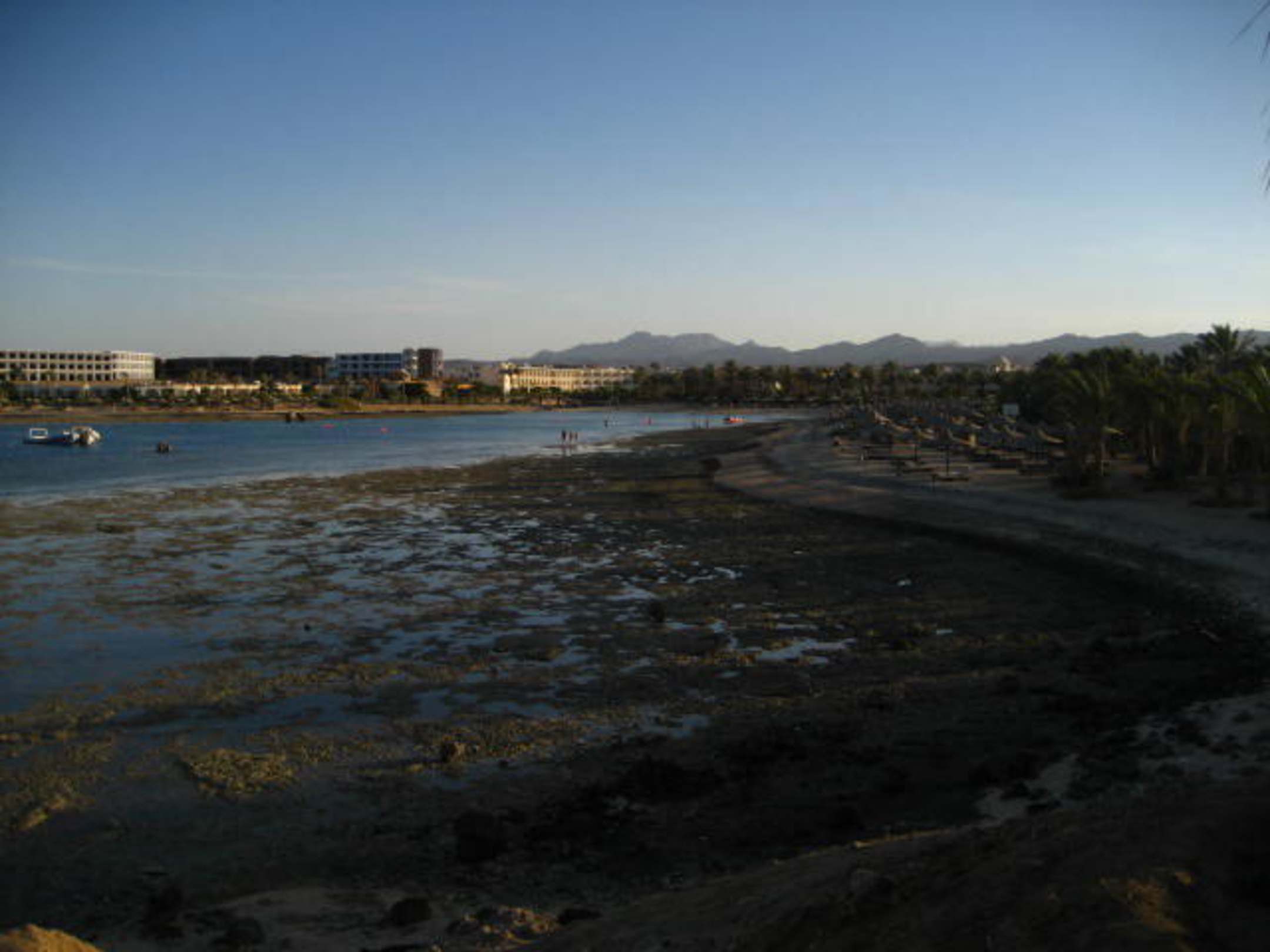 ...in die Bucht hinein. Im Hintergrund die Hotelanlage in den Strahlen der untergehenden Sonne, im Vordergrund das trocken gefallene Riffdach 28.06., 17.43 Uhr