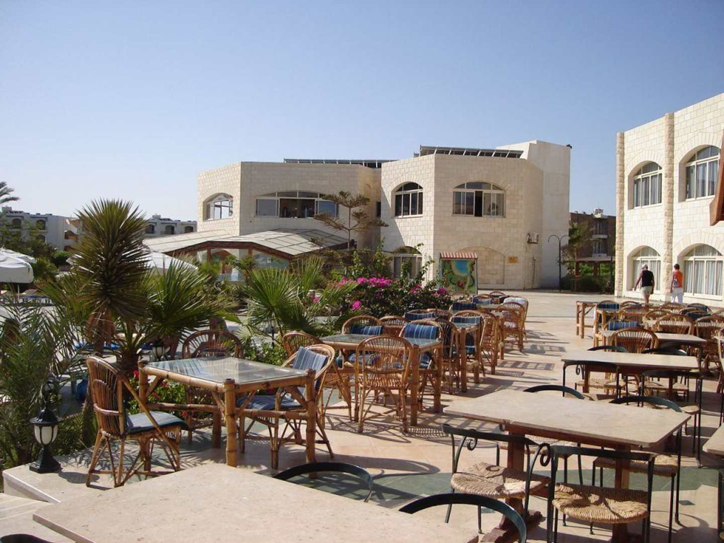 Ein Blick auf den Aussenbereich des Hauptrestaurantes. Im Hintergrund das Gebäude, in dem ein kleiner Fitnessraum und das Hallenbad untergebracht sind. Das Hallenbad wurde gerade renoviert und war deshalb geschlossen.