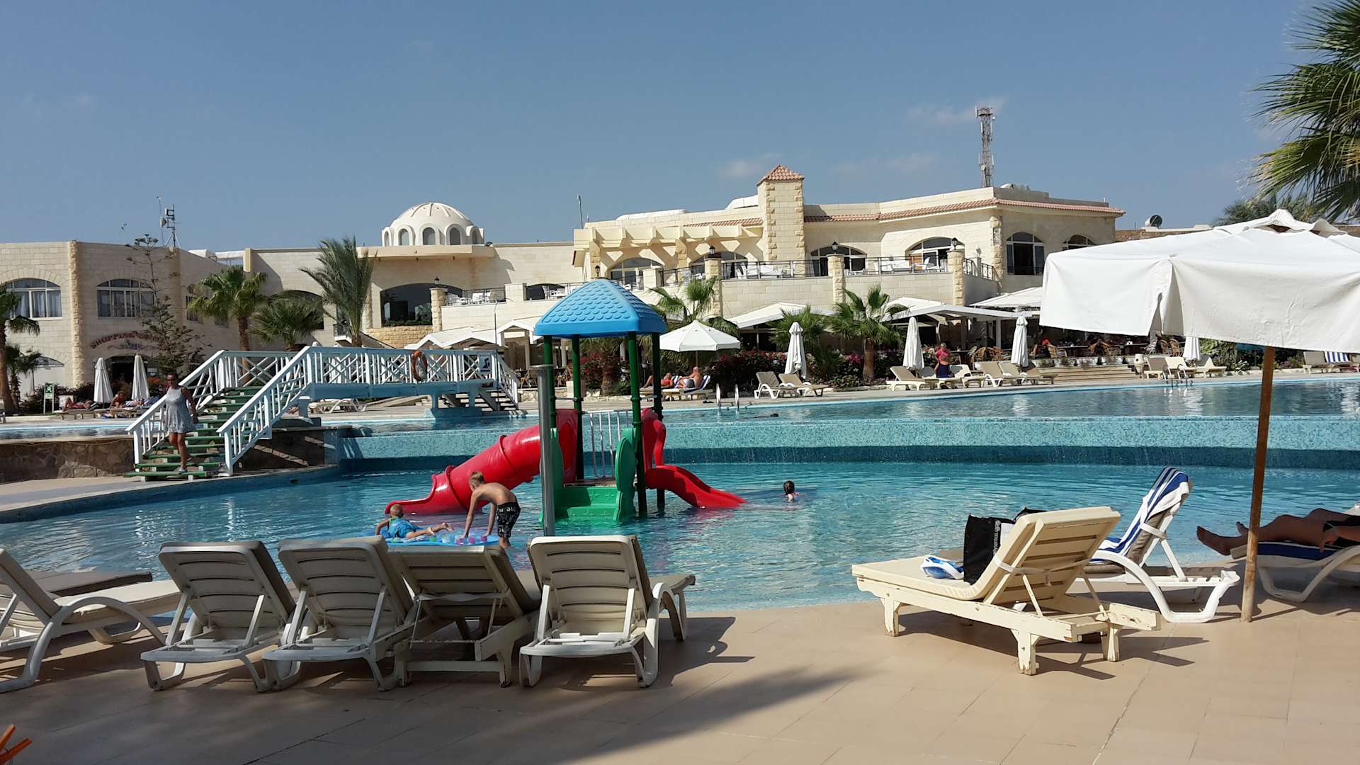 Blick vom Pool zur Lobby, Bar und Restaurant