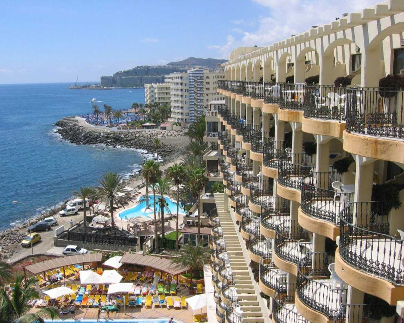 Ausicht vom Glaslift auf Balkons der Hotelzimmer und Küste