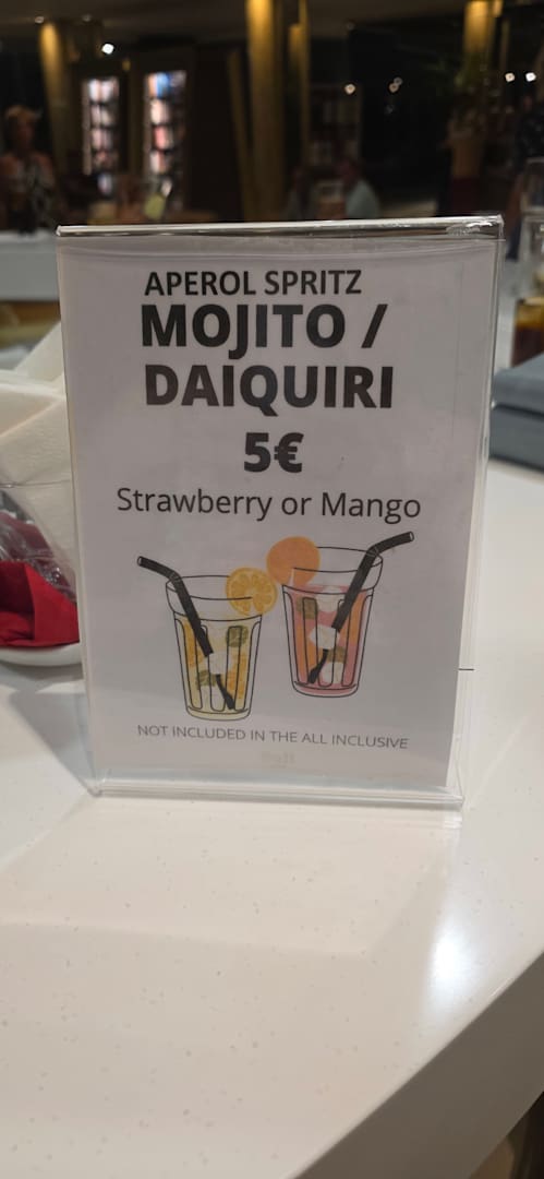 Flaschenwasser für mit auf das Zimmer in der Nacht kostet ebenfalls zusätzlich und ist nicht im AI enthalten. Keine Getränke in der Minibar/Kühlschrank.