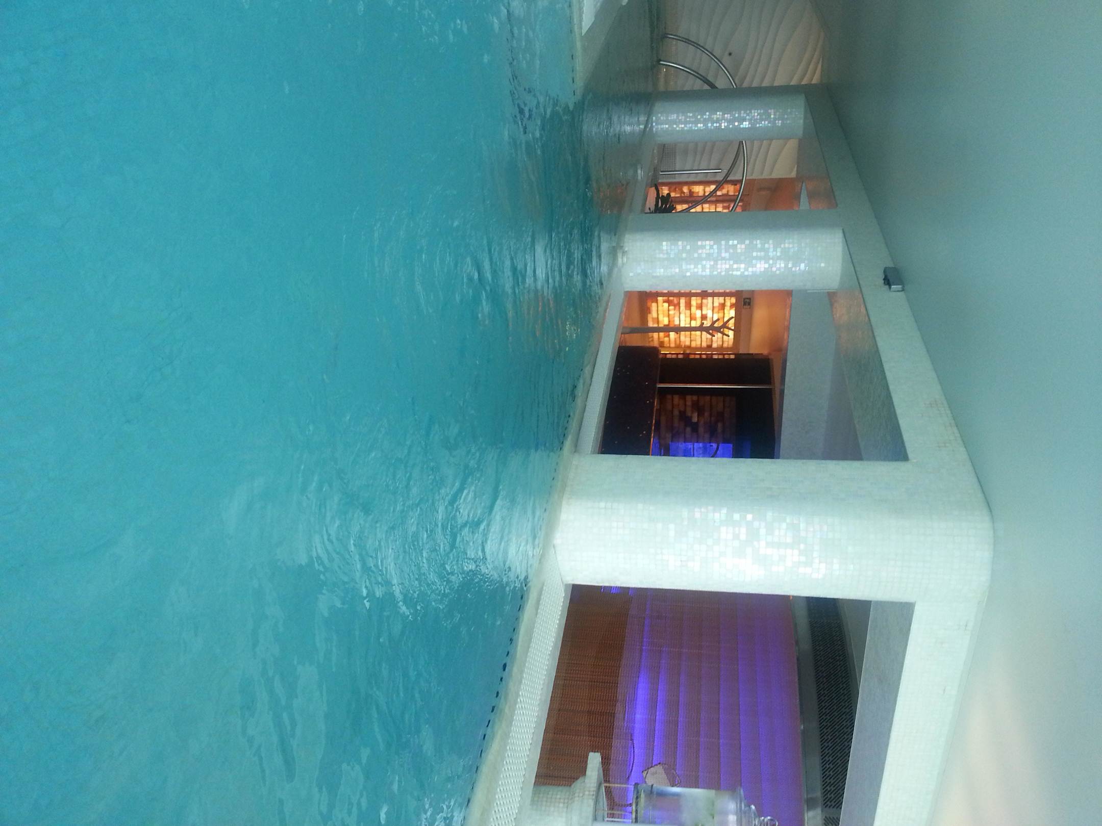 SchwebebeckenDas Wasser war herrlich warm und es waren etliche Sprühdüsen die man am Rand bedienen konnte. Wasserfall und Pilz, und Sprudelliegen. Rechts im Foto sieht man den Wasserspender mit Zitrone den konnte man gratis nutzen. Mehr als 2 Leute waren es nie