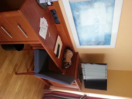 Unter dem TV stand der Kühlschrank und daneben war noch eine kleine Glasvitrine mit Gläsern. Wlan im ganzen Hotel gratis war super. TV hatte viele deutsche Programme. Nur die Musikanlage am Bett funktionierte nicht.