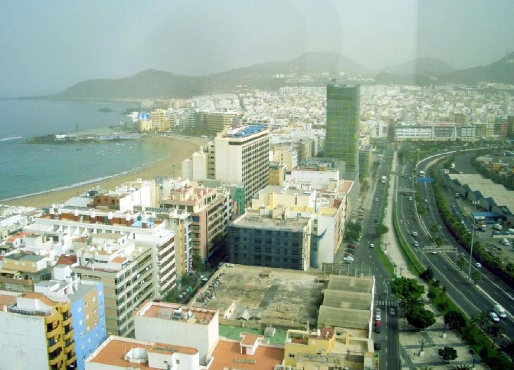 Luftaufnahm von Las Palmas auf Gran Canaria. Links sieht man den Strand mit der Promenade wo sich das Hotel Reina Isabel befindet.