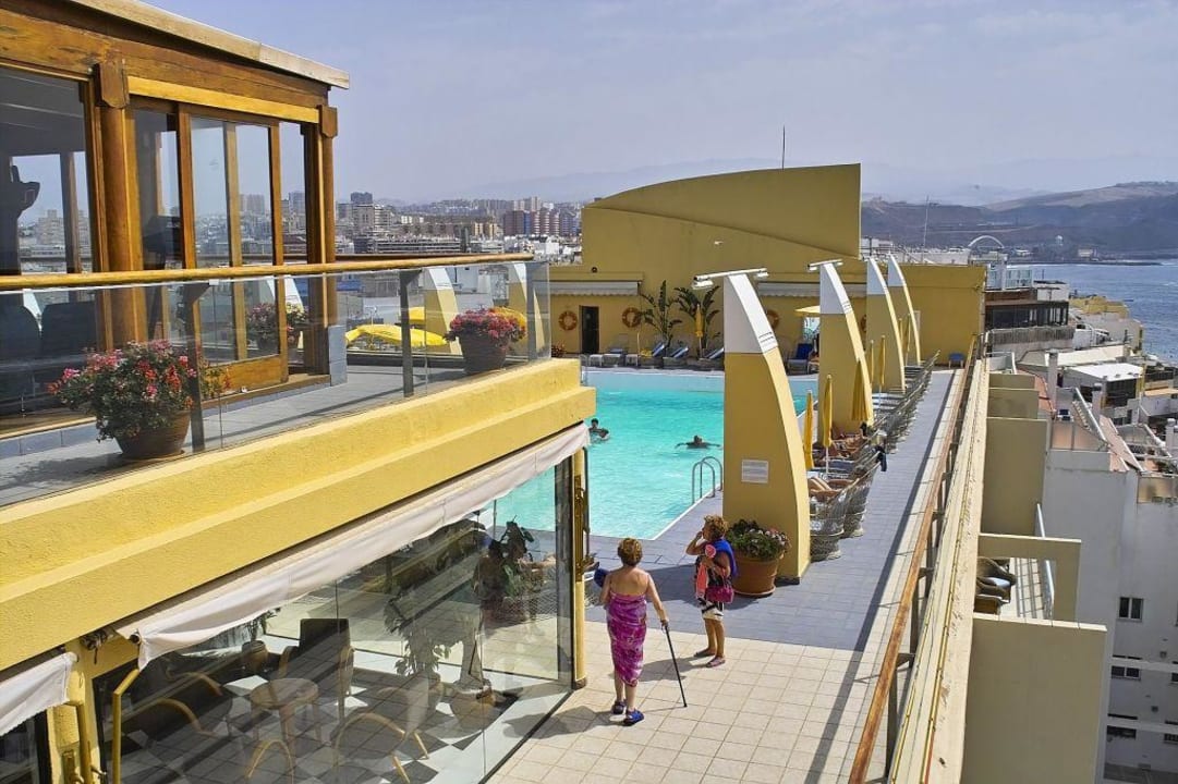 Gesamtansicht von der Dach-Pool-Anlage so wie dem Restaurant und oberhalb des Restaurants befindet sich der Fitness-Raum mit Super Aussicht auf die Stadt Las Palmas.