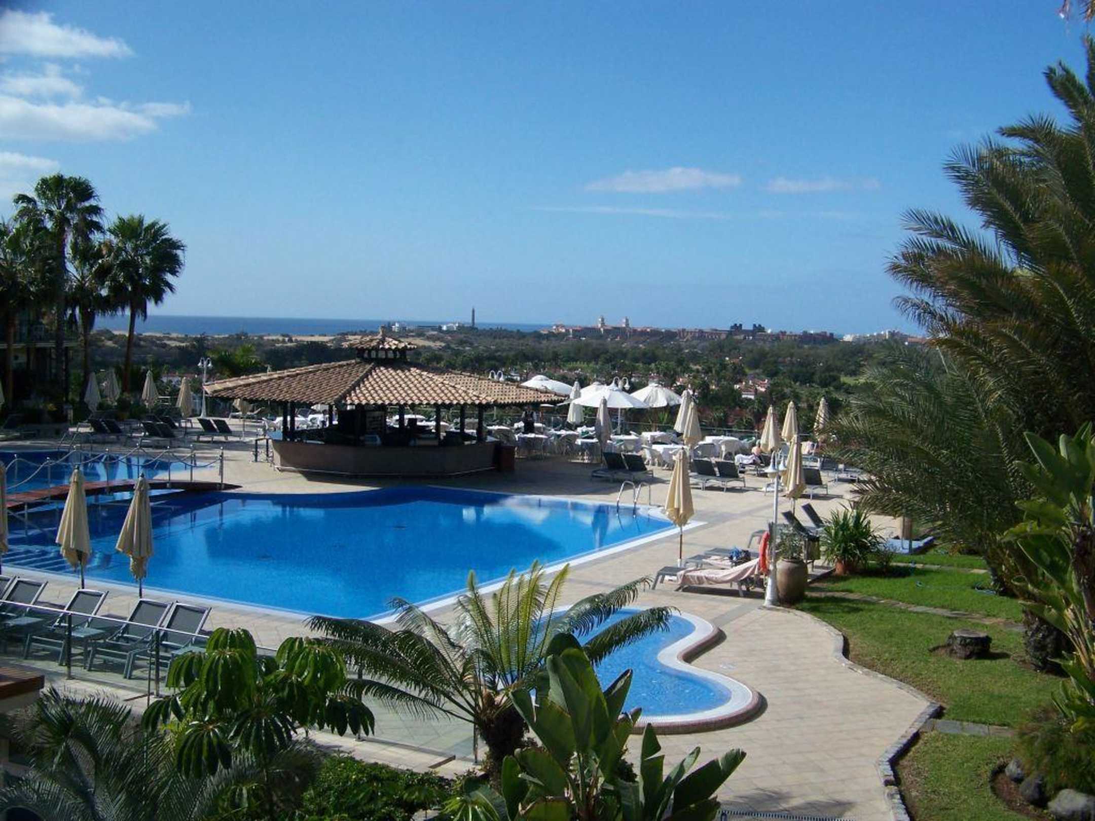 Blick in das Innere der AnlageBlick vom Eingangsbereich auf den Pool und die ganze Anlage bis zu den Dünen von Maspalomas.