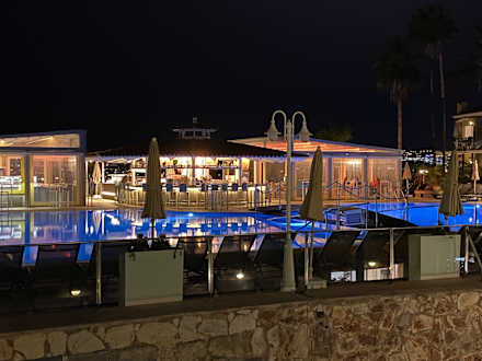 GastroRestaurant und Bar jenseits des Pools, Ansicht vom Zimmerbalkon aus