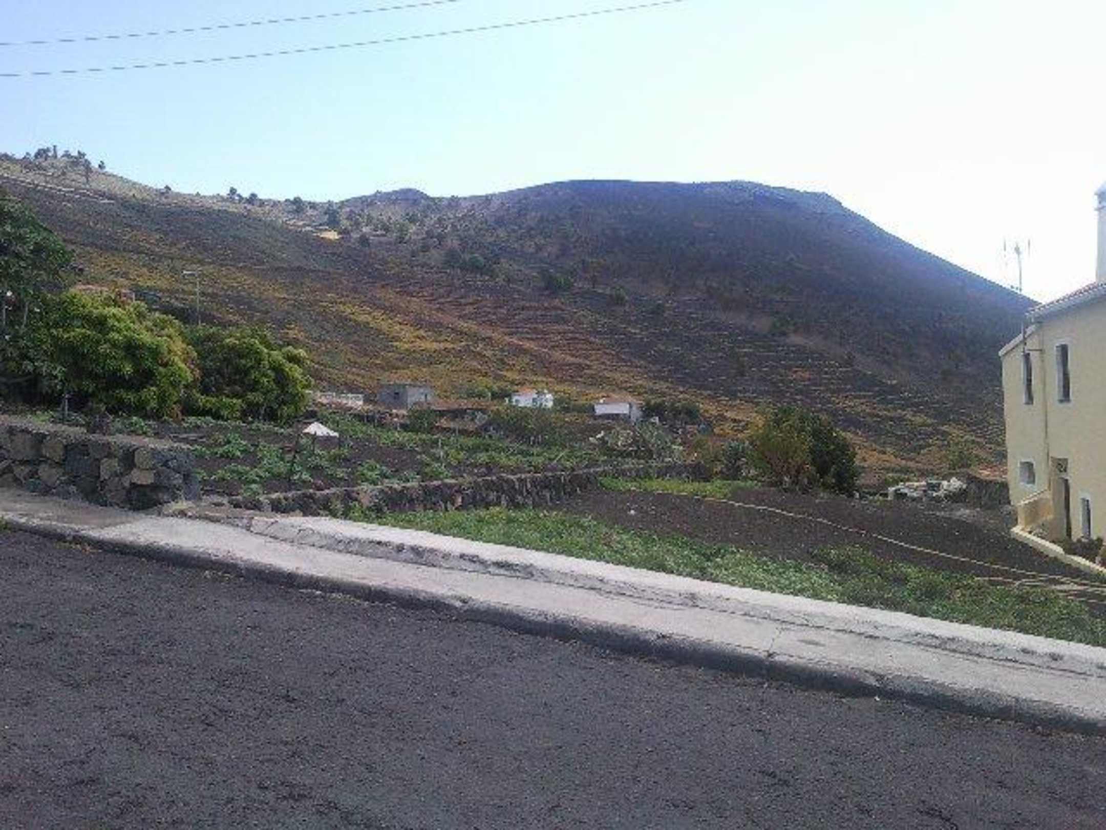 Landschaft unterhalb der Bungalowssteil abfallende Anliegerstraße, Gärten, dahinter Weinberge und dahinter der Vulkan Teneguia