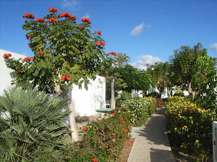 In der gepflegten Anlage gibt es viele blühende Hecken, Bäume und Sträucher
