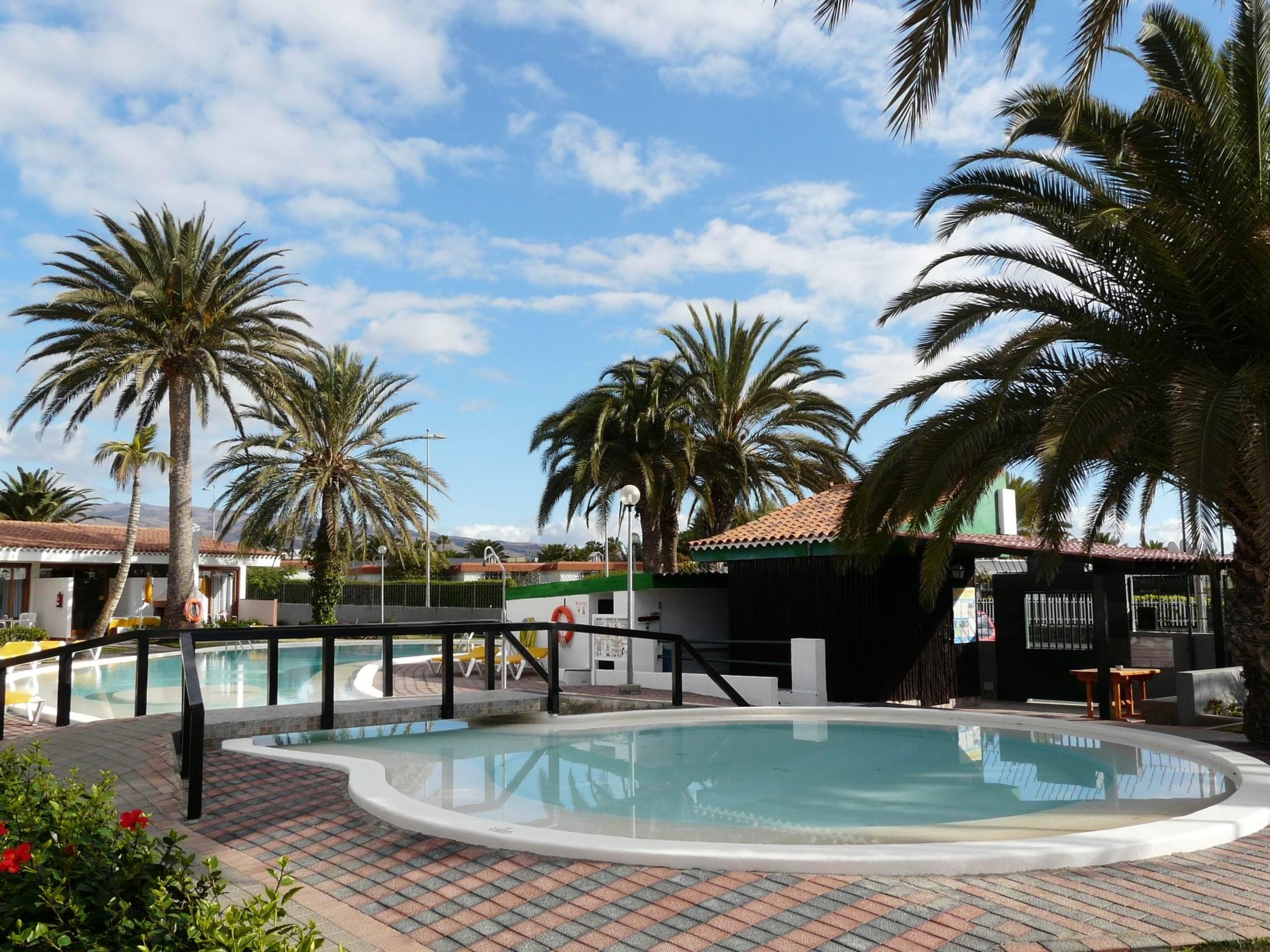 Pool mit Bungalows im Hintergrund.