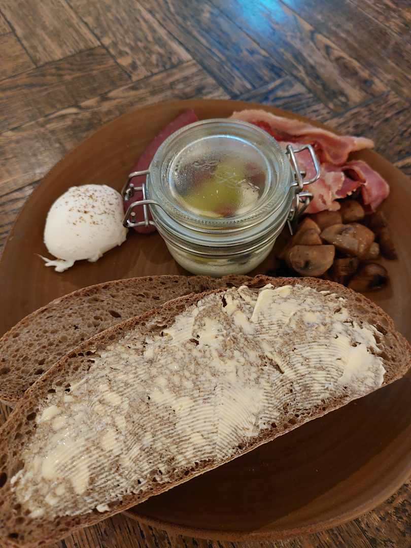 SonstigesPochiertes Ei, Champignons, Baron, Butter, zwei dicke Scheiben Brot und Quark mit Früchten