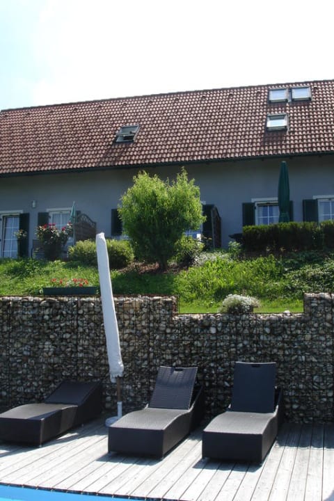 Blick vom Pool zum Gästehaus