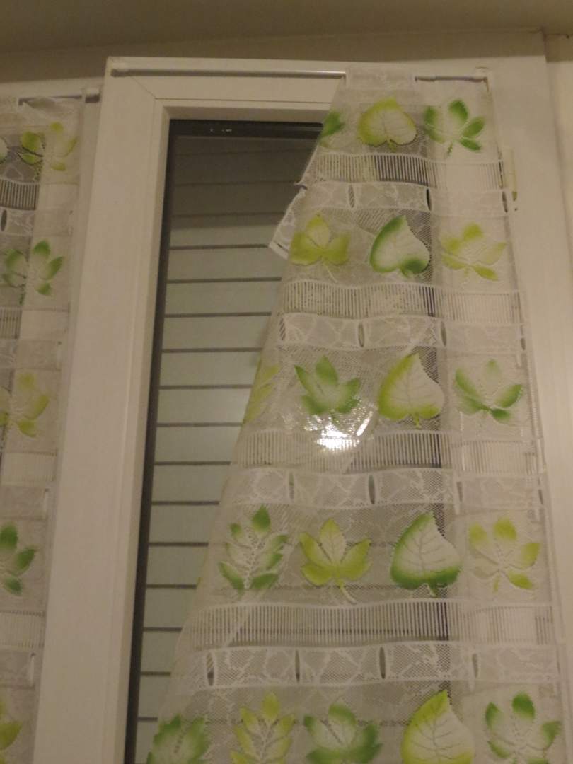 Halb heruntergefallene Gardine, zu hoch um selbst wieder anzuhängen