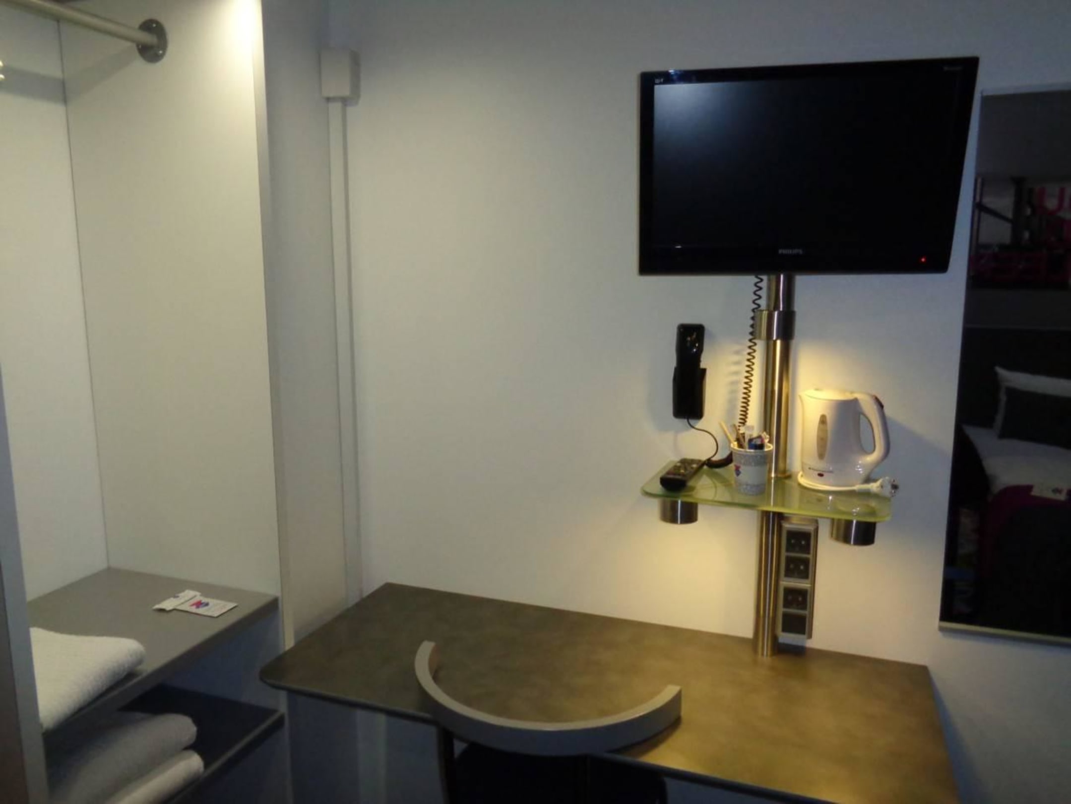 Schreibtisch, Flachbild-TV, Telefon, Ablage
