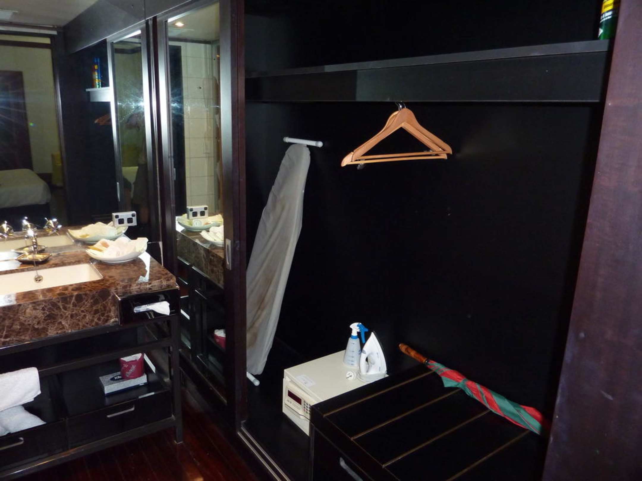 Waschbecken des Bads; Gaderobe mit dem Zimmersafe.