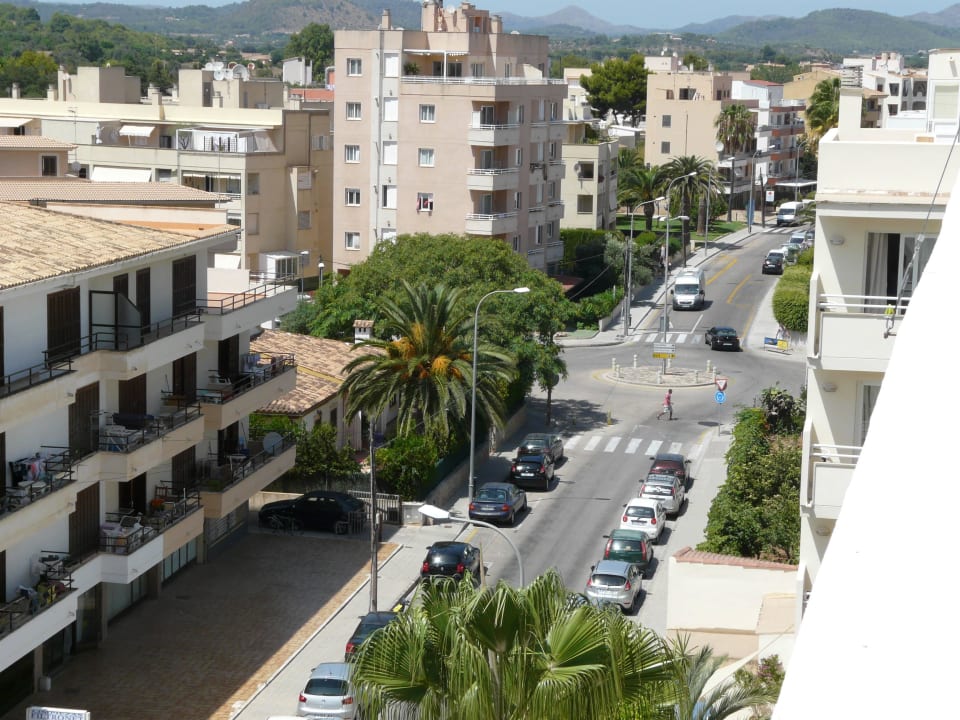 Blick auf die Rückseite des Hotels. Hinter dem Kreisverkehr ist die Bushaltestelle, von wo aus auch die gebuchten Touren von ITS starten. Auch die Bimmelbahn von Cala Millor hält dort.