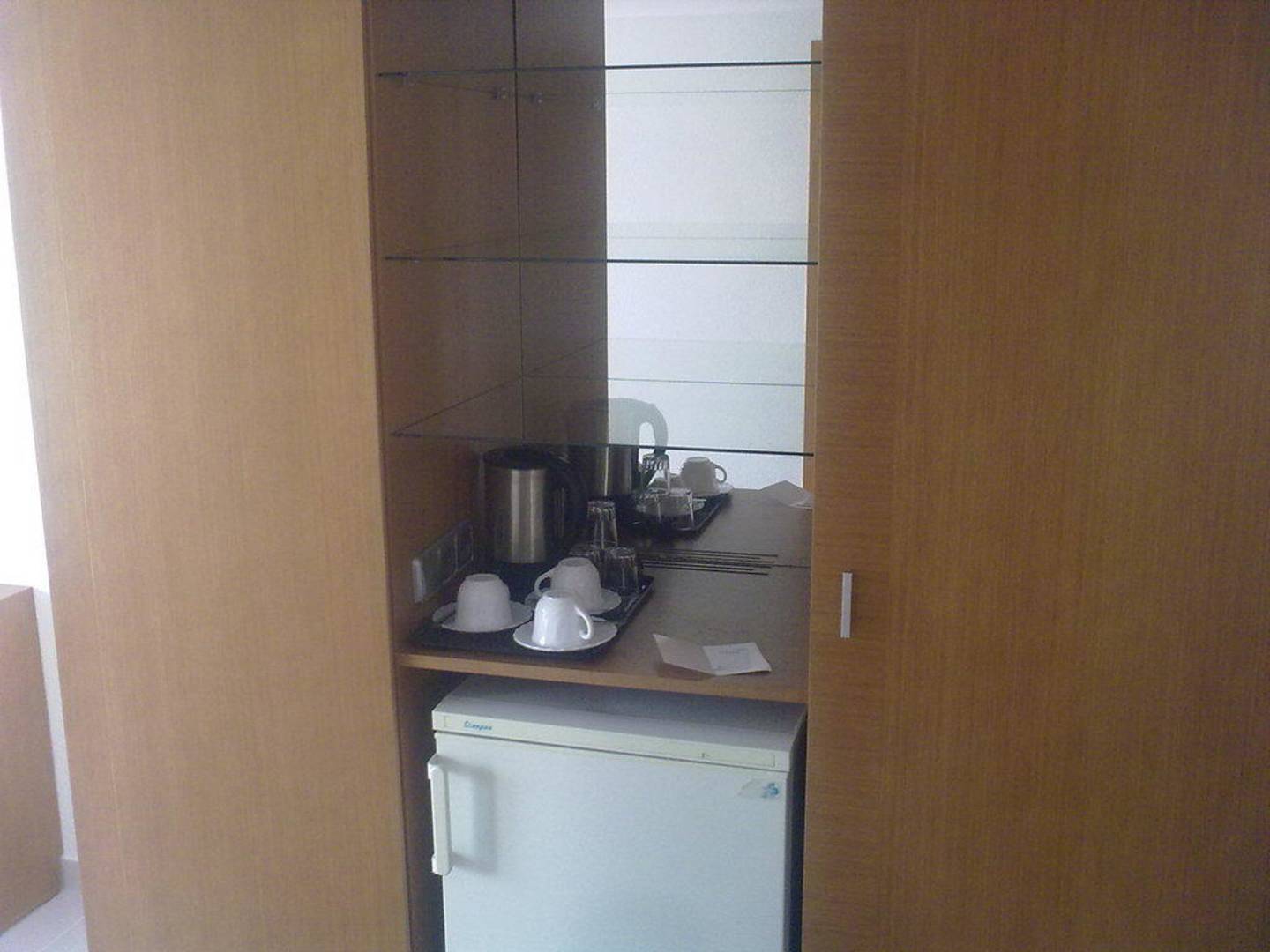 Wenn man es so nennen darf: Wasserkocher und Kühlschrank und jeweils drei Tassen und Gläser. Rechts noch ein Schrank für Jacken und die Koffer passen sehr gut hinein!