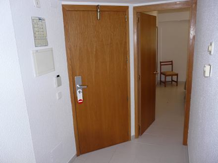 Flur 232Eingangstür links und Schlafzimmer rechts, rechts im Bild die Steuerung der Klimaanlage für den Wohnbereich. Links Sicherungskasten und Steckplatz für Stromfreigabe mittels der Türcodekarte. Ohne die Karte dort zu stecken gibt es im Zimmer kein Strom