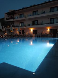 PoolPool im Village. Schön beleuchtet. Hinten mittig, das sollte ursprünglich unser Zimmer werden... mit direktem Zugang zum Pool...
