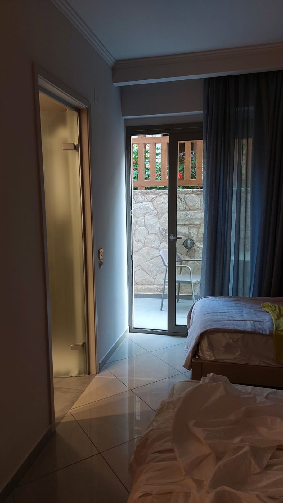 ZimmerDunkel, da Terrasse mit Ausblick auf Mauer. Ohne Licht geht auch tagsüber nichts. Viel zu geringe Ablageflächen, Bad viel zu eng für 3 Personen!