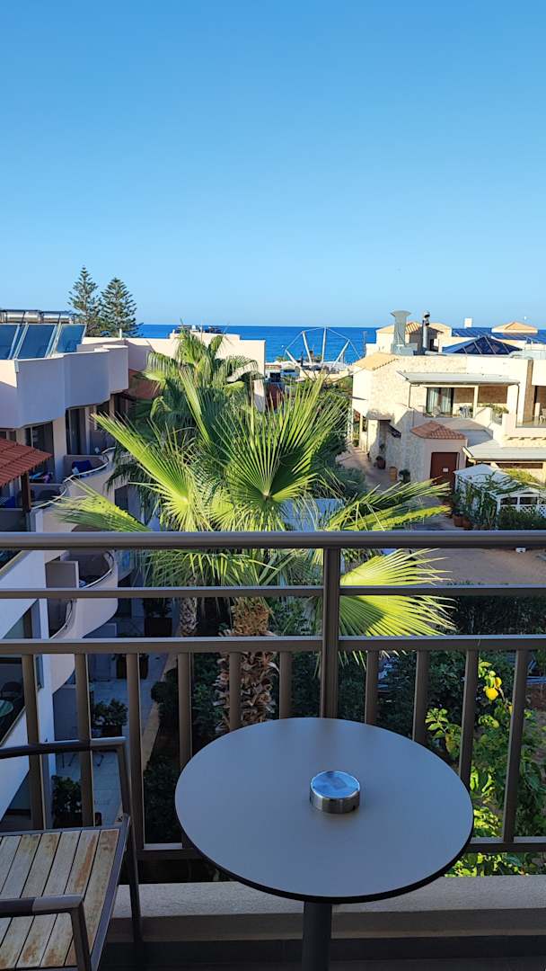 Herrlicher Blick über die Anlage und eine kleine Windmühle zum Meer von unserem Balkon