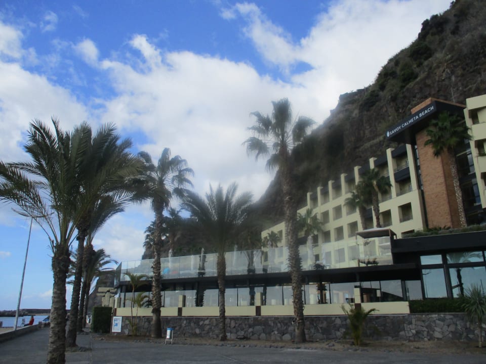 Oberhalb ist die Sonnenterrasse vom Hotel Savoy Calheta. Im unteren Bereich befindet sich das Restaurant in dem Frühstück, Mittagessen und Abendessen serviert werden.