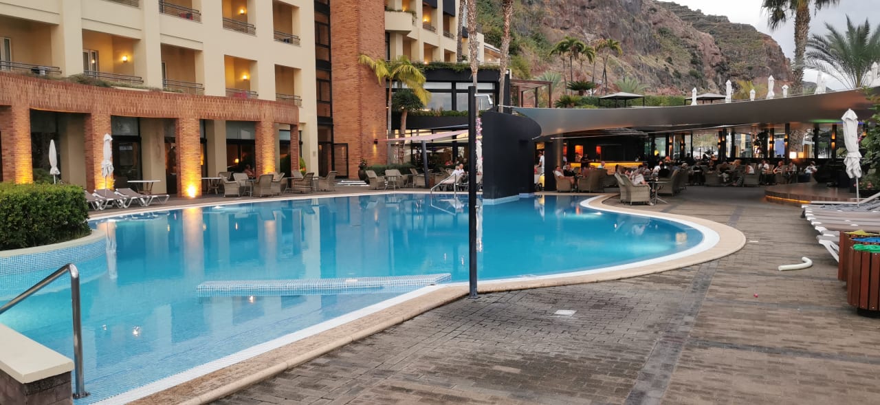 Der Pool am Abend mit Bar im Hintergrund