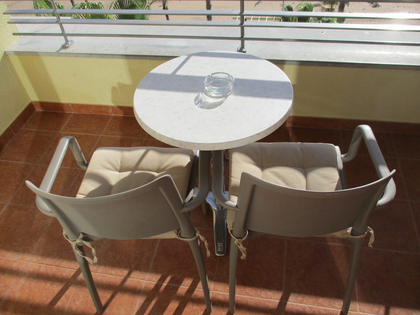 Ausreichend Platz bietet der Balkon im Calheta Beach Savoy Hotel auf Madeira. Ein Tisch, zwei Stühle und für Raucher den Aschenbecher. Regelmäßig wird vom Zimmermädchen auch dieser Bereich gesäubert.