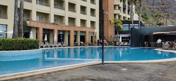 Hotel, Poolbar und Pool gegen Abend