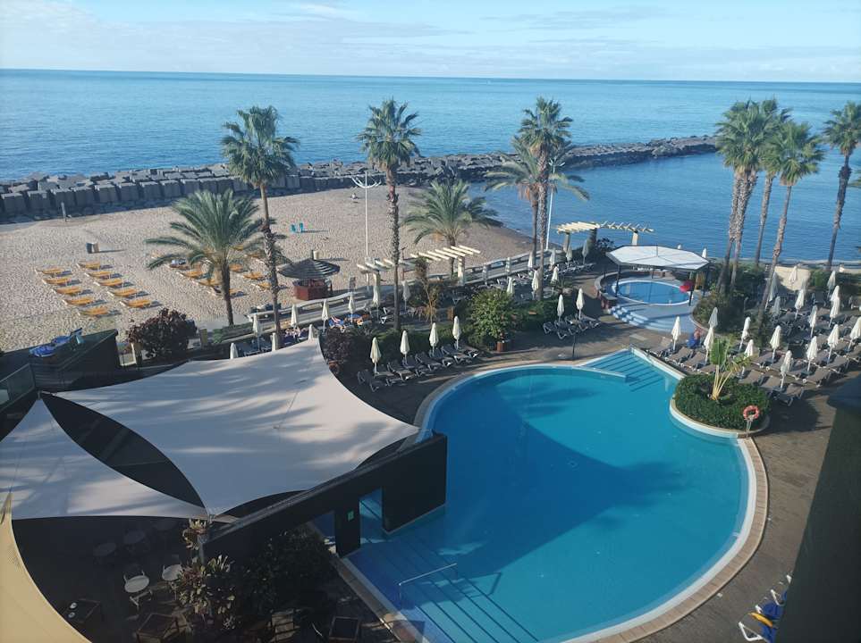 Ein Blick vom 2. Stock über Pool und Meer.
