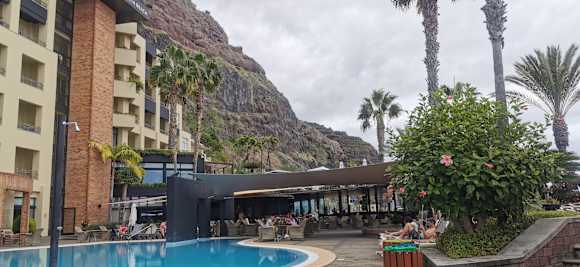 Hotel, Poolbar und Pool gegen Abend