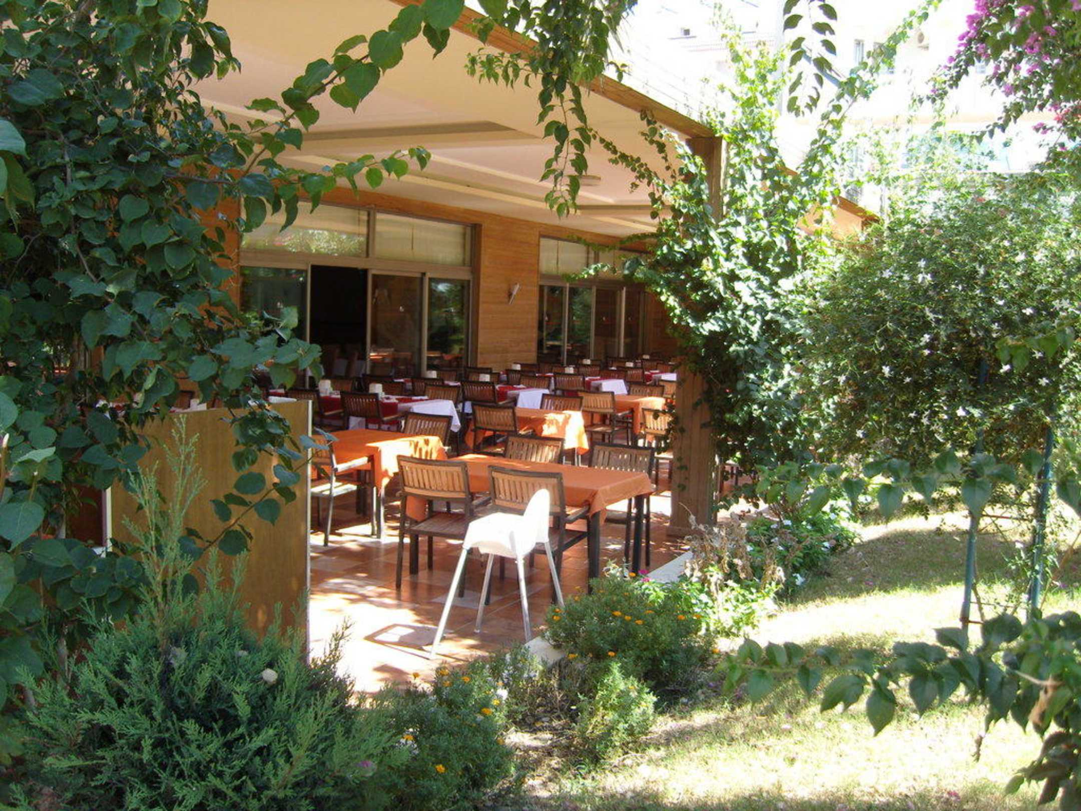 Blick vom Garten zum Restaurant