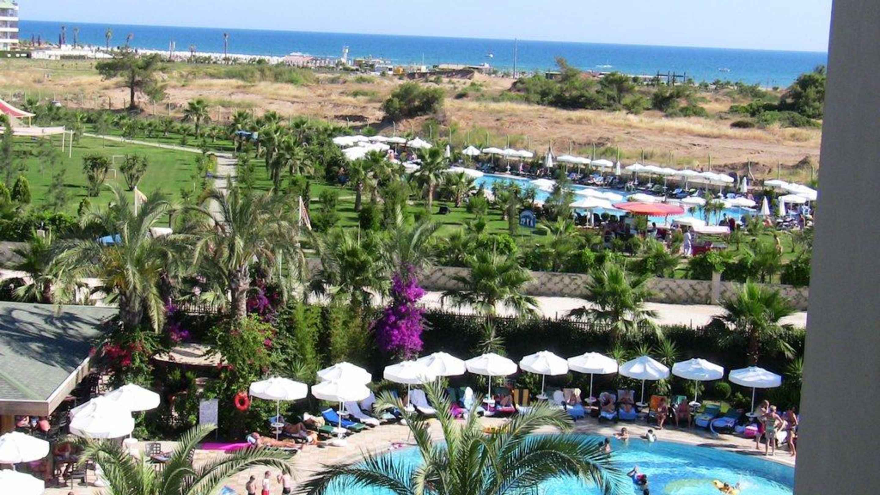 Blick über die Gartenanlage zum Strand