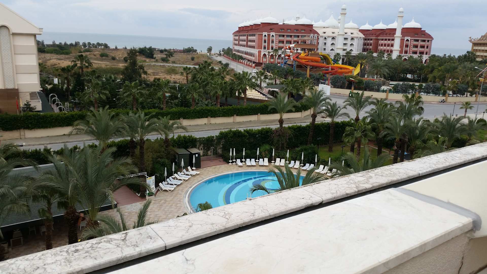 Blick vom Balkon auf dem Pool und das Meer