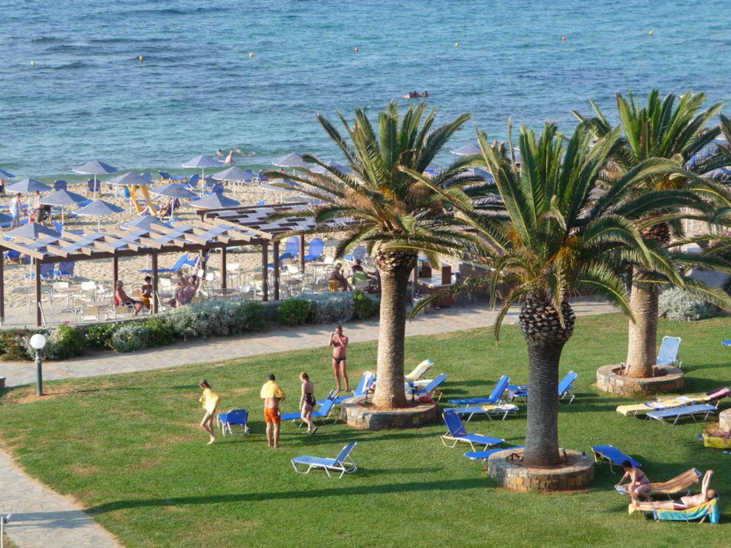 Meer und Strandbargenau hinter den 3 Palmen befindet sich die Strandbar. Man sieht die Tische davon auf dem Bild von unserem Zimmer aus