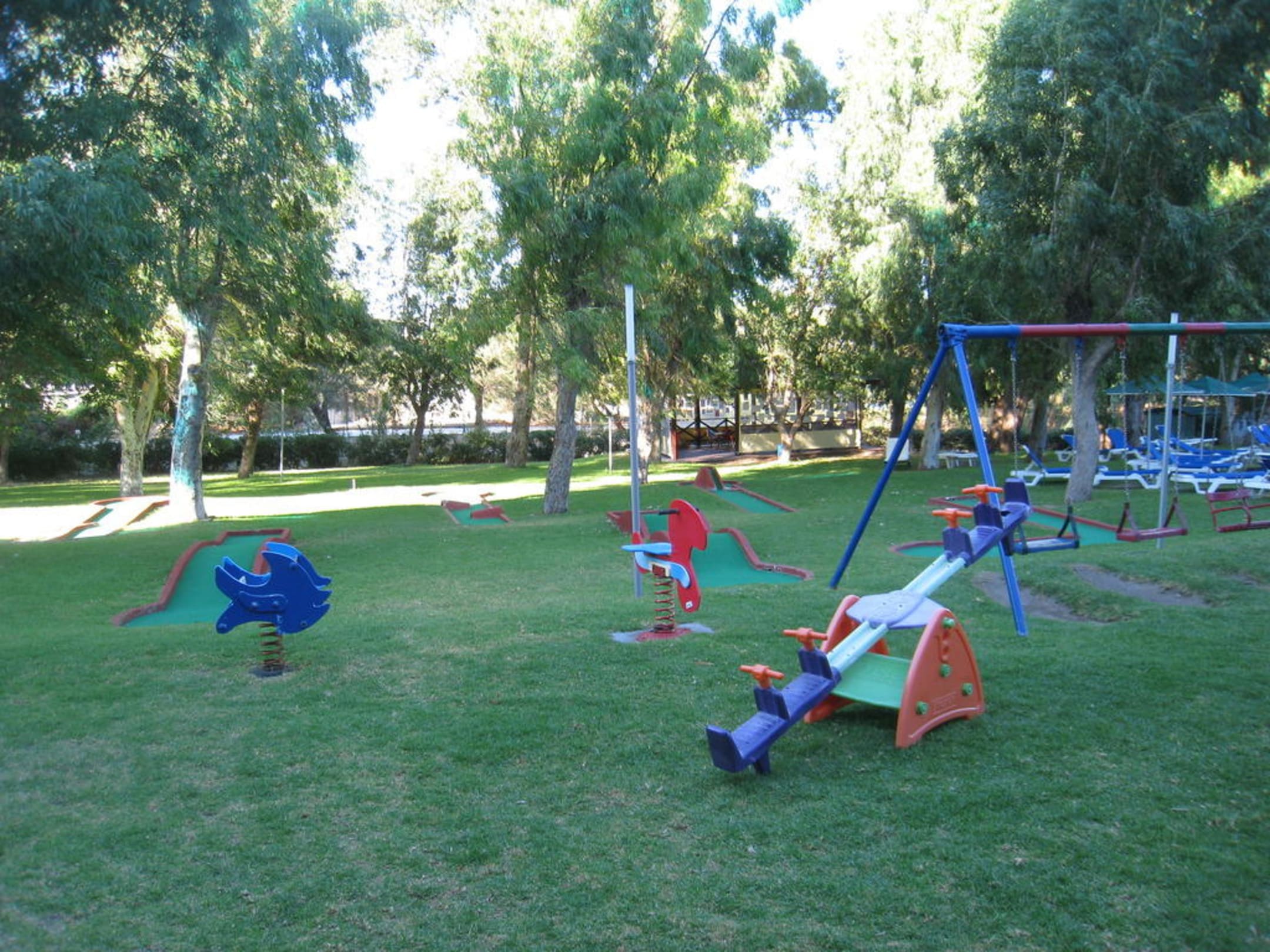 Im Vordergrund ein kleiner Teil des Kinderspielplatzes, links ein Teil der Minigolfanlage, im Hintergrund das Häuschen der Kinderbetreuung (rechts-nicht zu sehen-der Kinderpool)