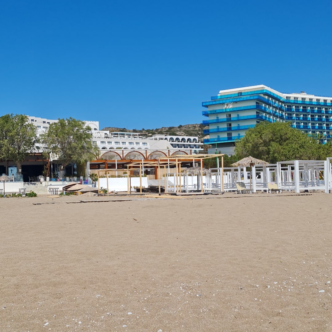 Strand mit Blick auf das Calypso Beach Hotel u d links auf das Calypso Palace