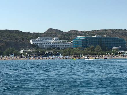 Blick vom Meer auf Calypso Palace und Calypso Beach