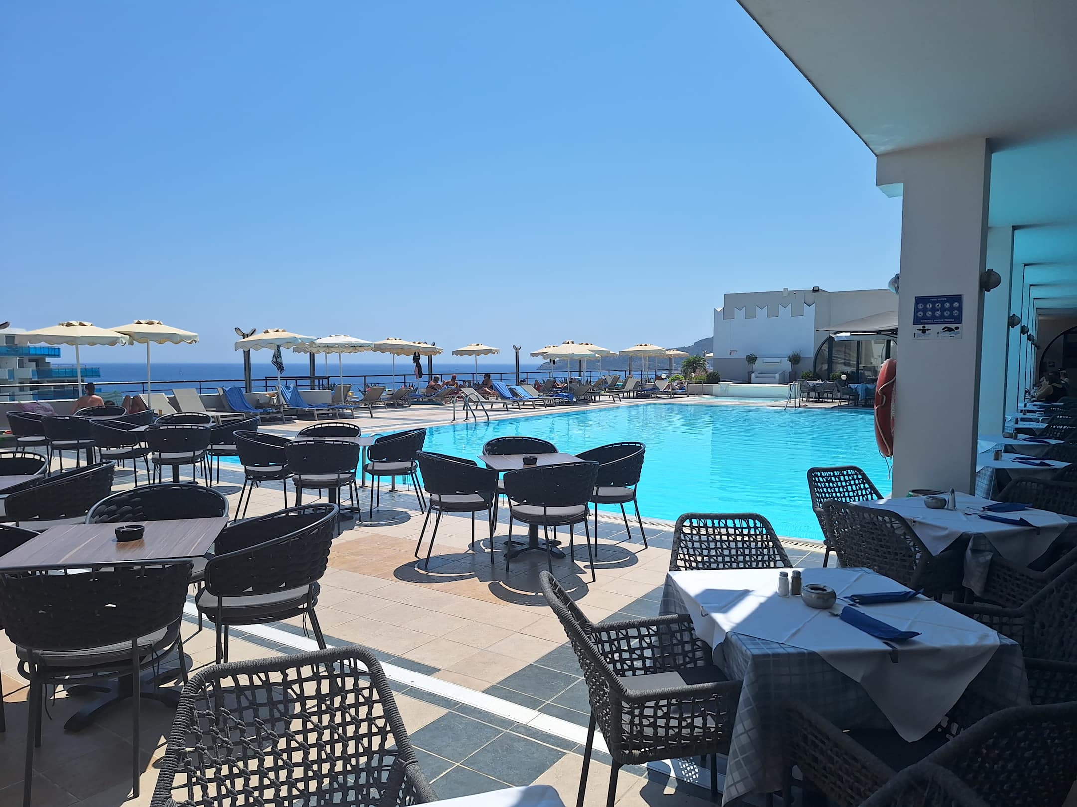Pool, Restaurant (eigedeckte Tische) und Bereich der Abendunterhaltung