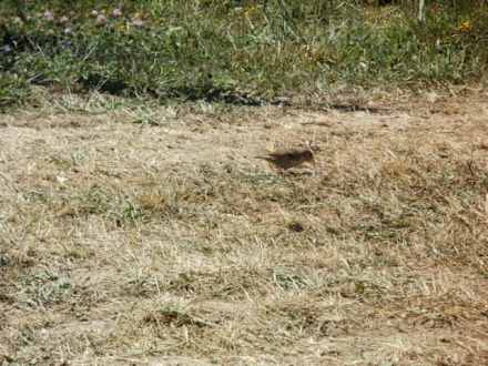Ein Vögelchen pickt Brotkrümel zum Frühstück auf.