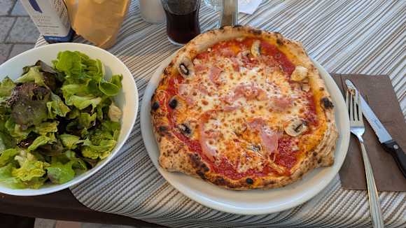 Pizza und Salat auf dem Campingplatz.
